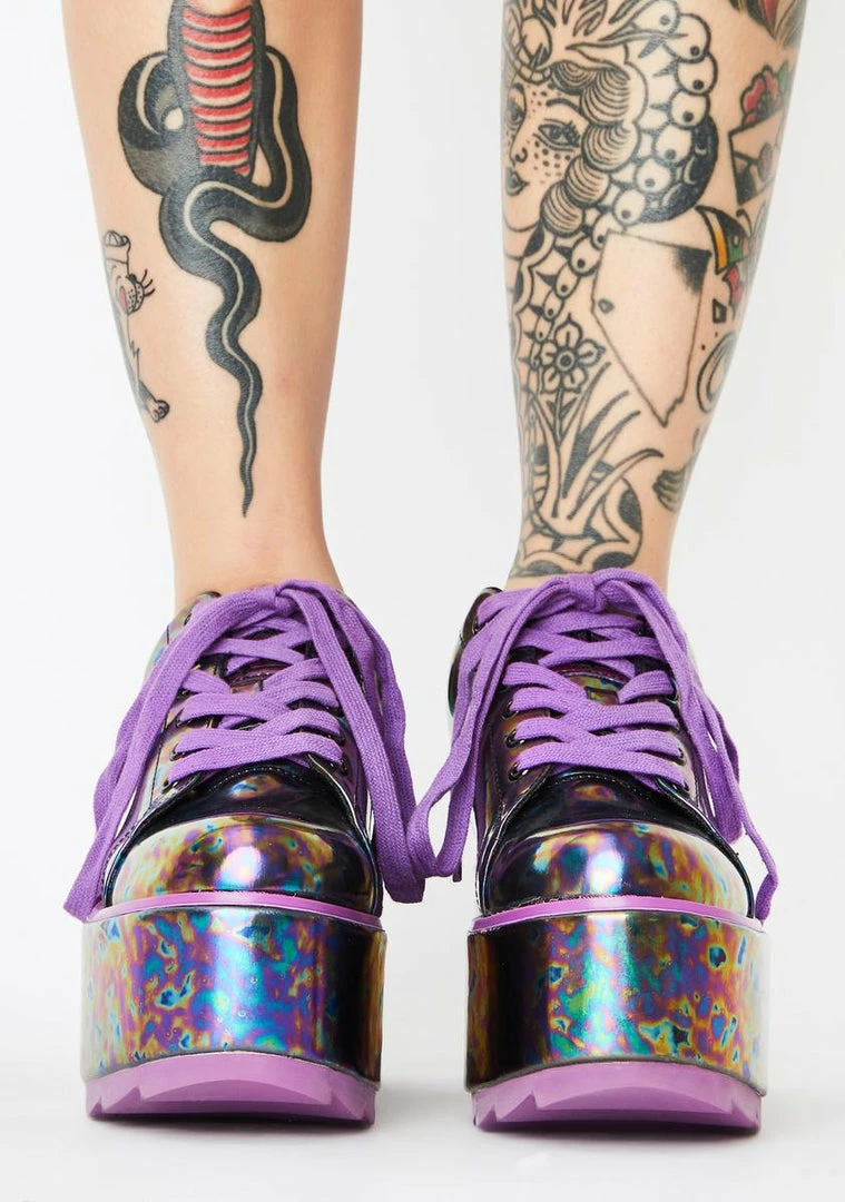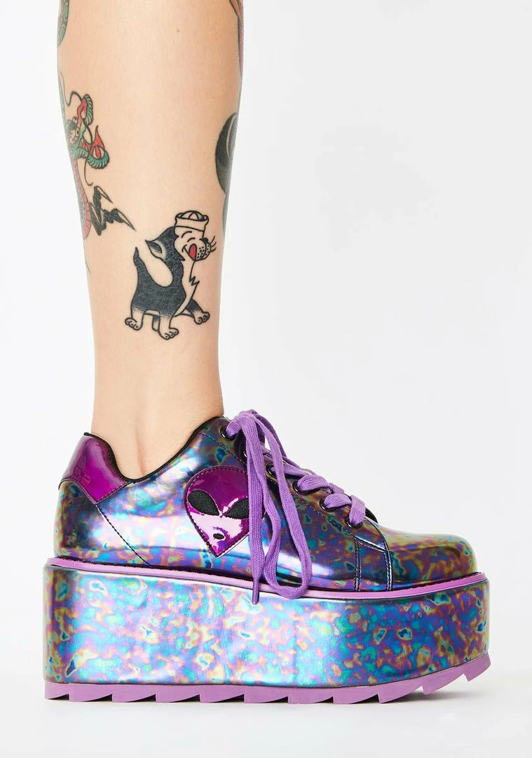 cuz youΓ’ΒΒre outta this world, bb! Rule the planets in these platform sneakers that have an oil slick iridescent vegan leather construction with contrast neon purple trim, adjustable lace-up closures, and cute lil aliens.