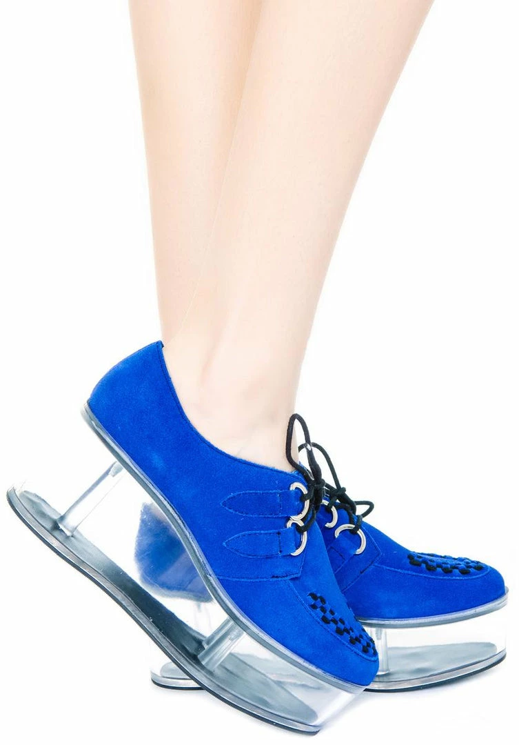 Y.R.U. Qloud Kreeper are giving the term “blue suede shoes” new meaning. Walk like yo walkin on clouds, all Moses and shit…partin those seas right? We love the lucite clear platform bottoms on these babies. Soft faux suede upper and lace up detailing. We are obsessed with these new YRU bad boyz. Dress em up for a night out or down for your daily kickwear.