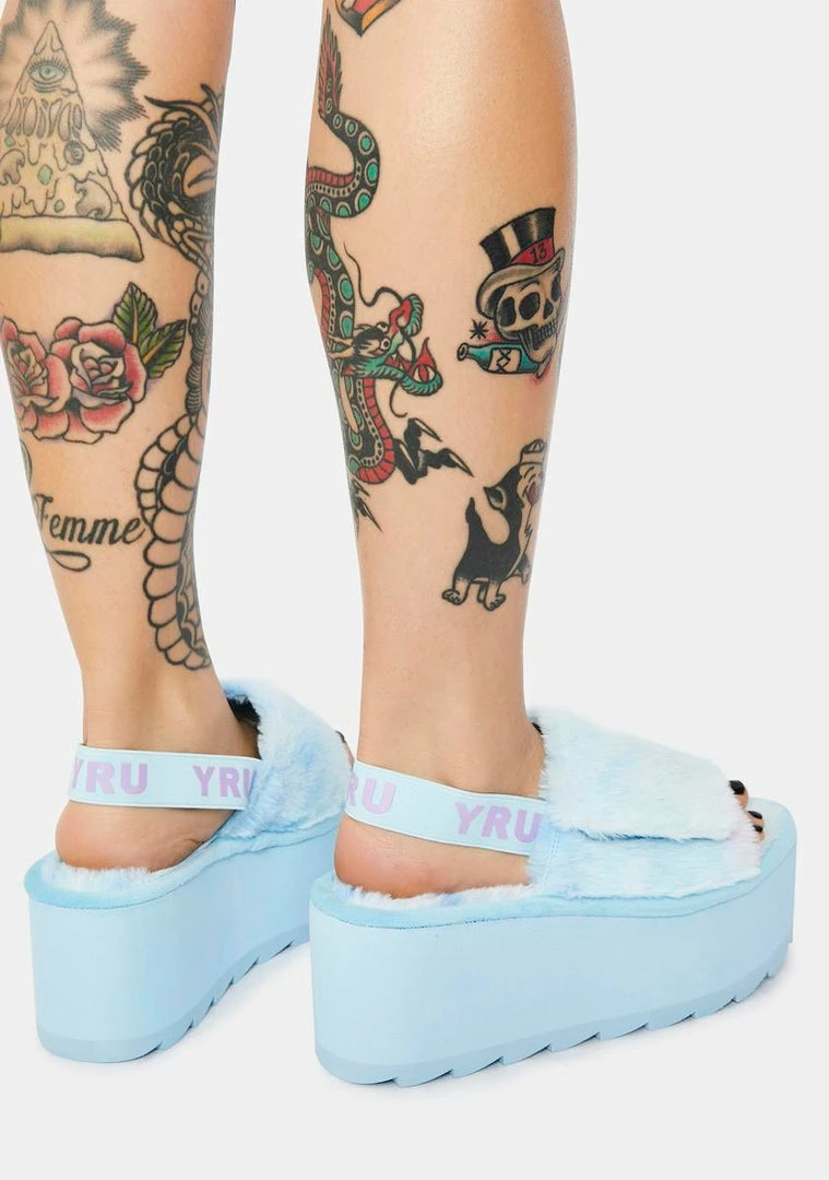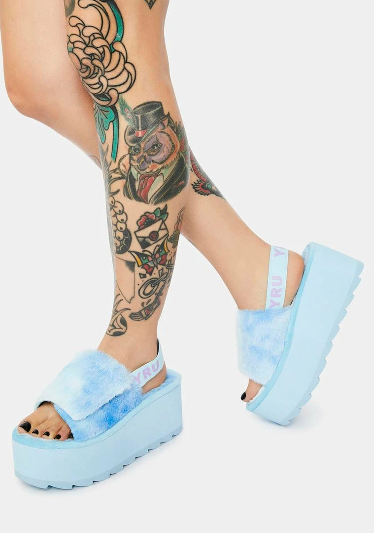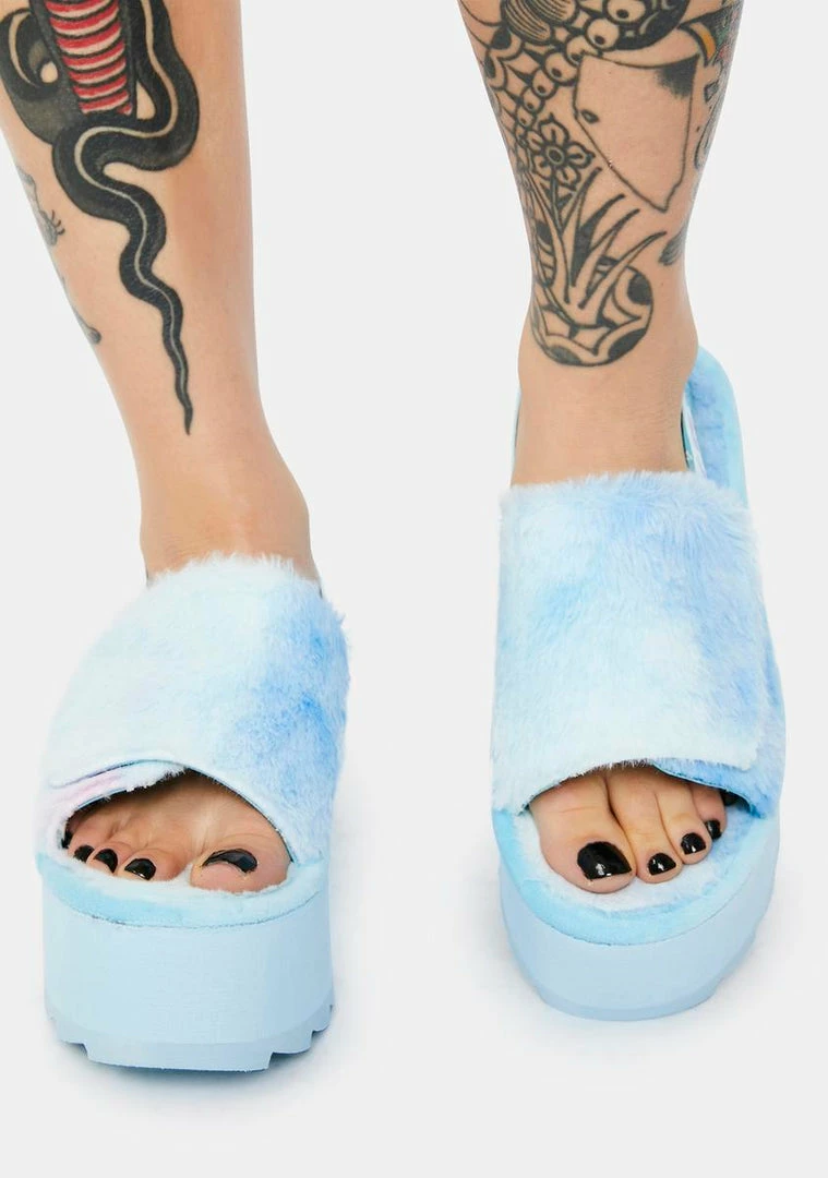 cuz you always keep it cute. These platform slides have baby blue tie dye faux fur uppers and linings and branded elastic back straps.