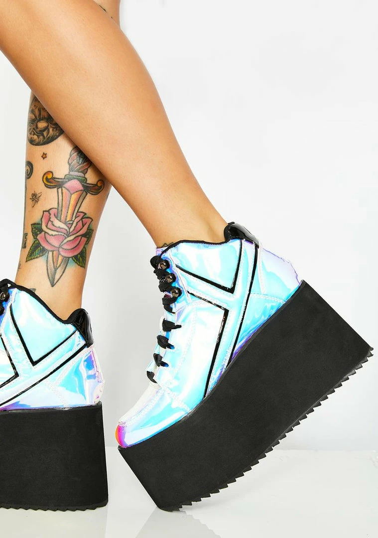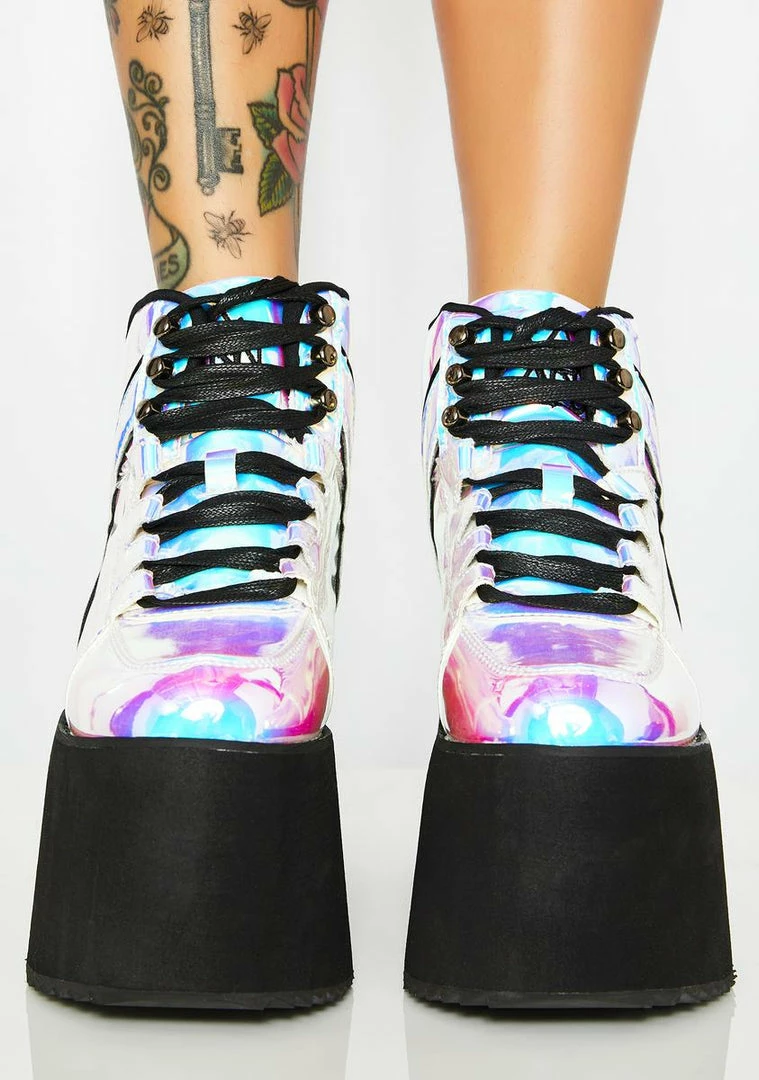 got ya shininΓ’ΒΒ so bright. These dope sneakers have thikk platform soles, a shiny iridescent exterior, and lace-up front closures.