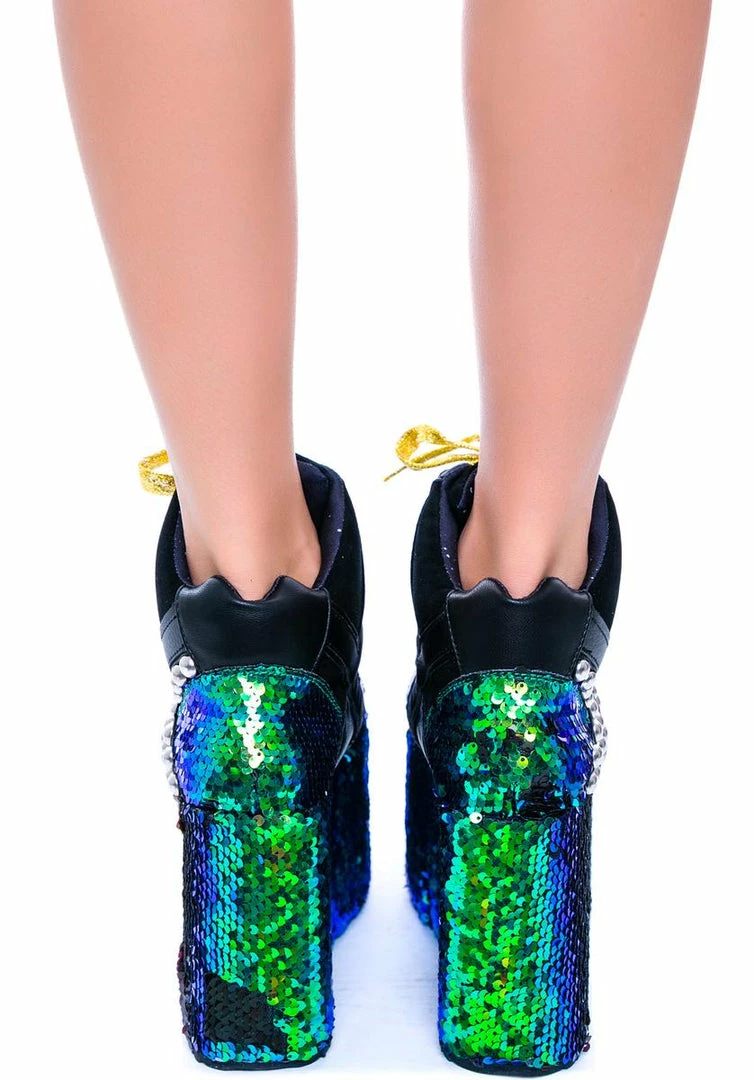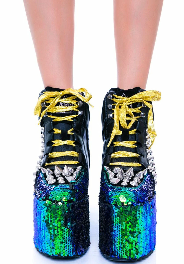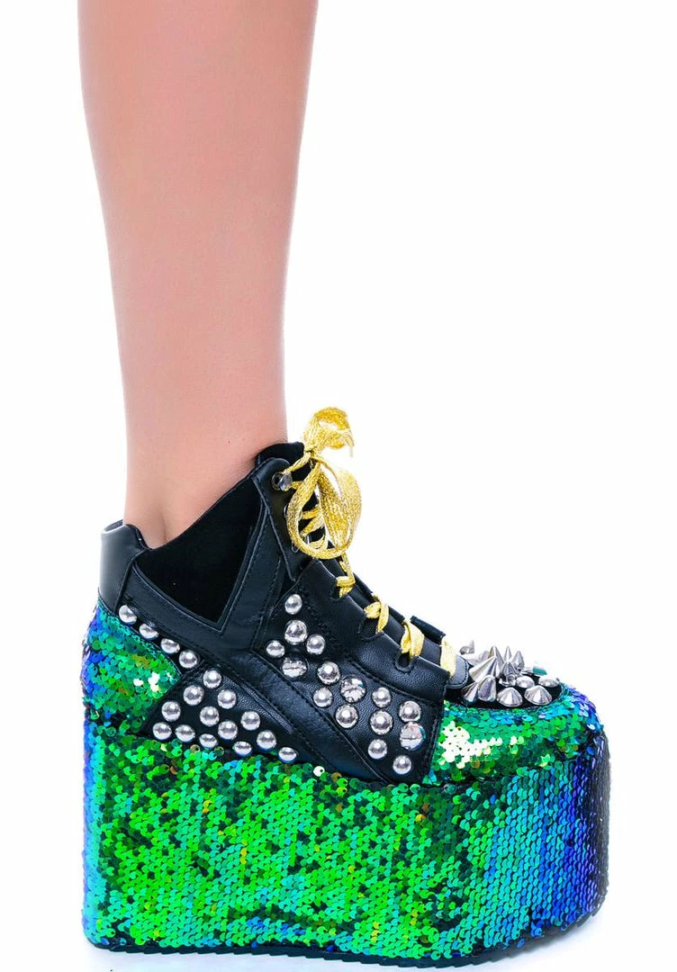 Y.R.U. Qozmo Dragon yer too hot to handle, you know that? These amazing, lace up sneakers are the fukkinΓΒ best. With their gold laces and super shiny studs and sequins throughout the body, we may have just be fallin’ in love! StayinΓΒ a level above the haterz, with their multicolored sequined gold and green platform that rises 4ΓΒ in the back and 3ΓΒ in the front, we are sure that in these scaly sneakers yer gonna be breathin’ fire soon enough!