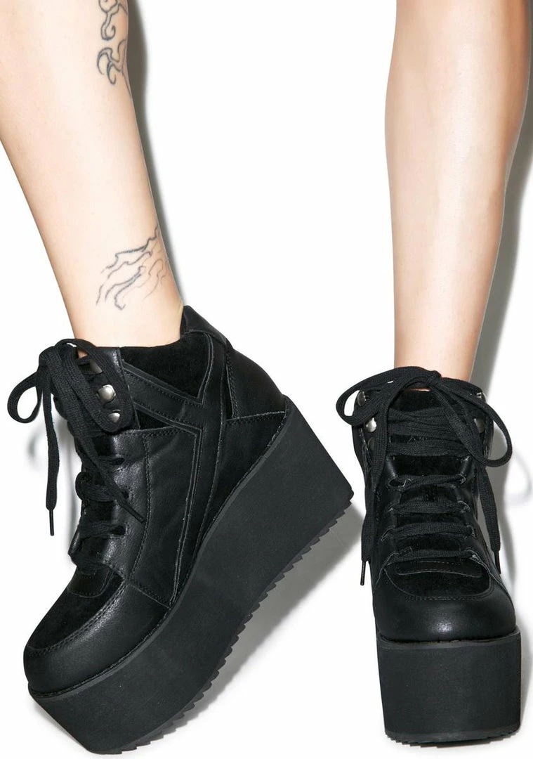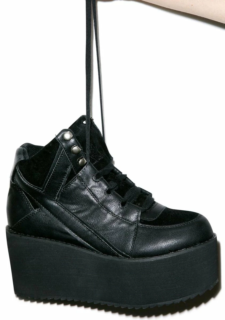 cuz when yer feelin lo, itΓ’ΒΒs time to get high! These monster platform sneakers feature a hi-top blacked-out design with a 4Γ’ΒΒ platform and a classic Γ’ΒΒYΓ’ΒΒ design on the side. Strut yer stuff in style with these stilts!