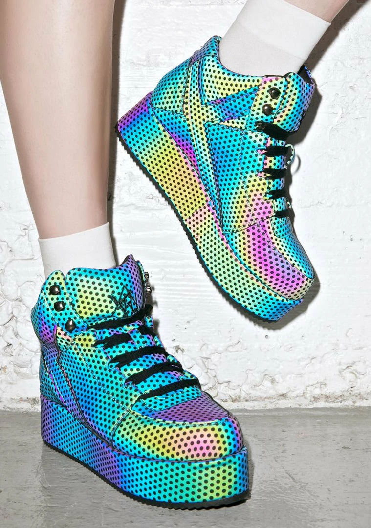 look anything but chill on yer feet. These platform sneakers are turnt all da way up with their vegan leather construction and magical hologram coating that looks like a dope color shifting oil slick to the naked eye, but when ya add a camera’s flash and POW these bbs are rainbow reflective with an all over contrasting dot print. Featurinâ rounded toes, 2 1/4″ heels, 1 1/2″ platform and front lace closure.