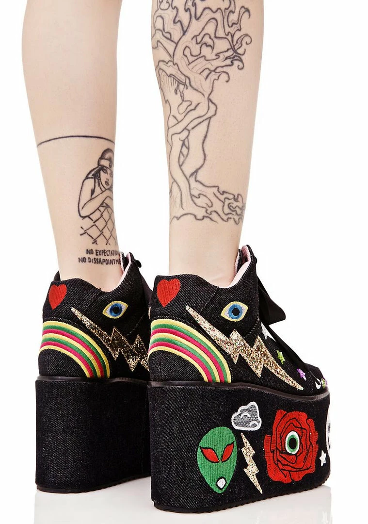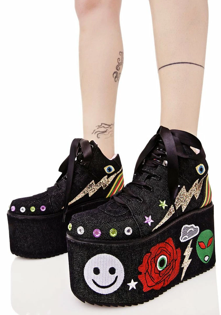 is evolving at an accelerated rate, babe!! These insanely updated Qozmo platforms feature a black denim construction, glittery lightning boltz down the sides lil crystals studded around the toe, embroidered patches on the platform of aliens, smileys, âN all-seeing eyes, transparent tongue wit star glitter fill, and satiny black lace-ups.