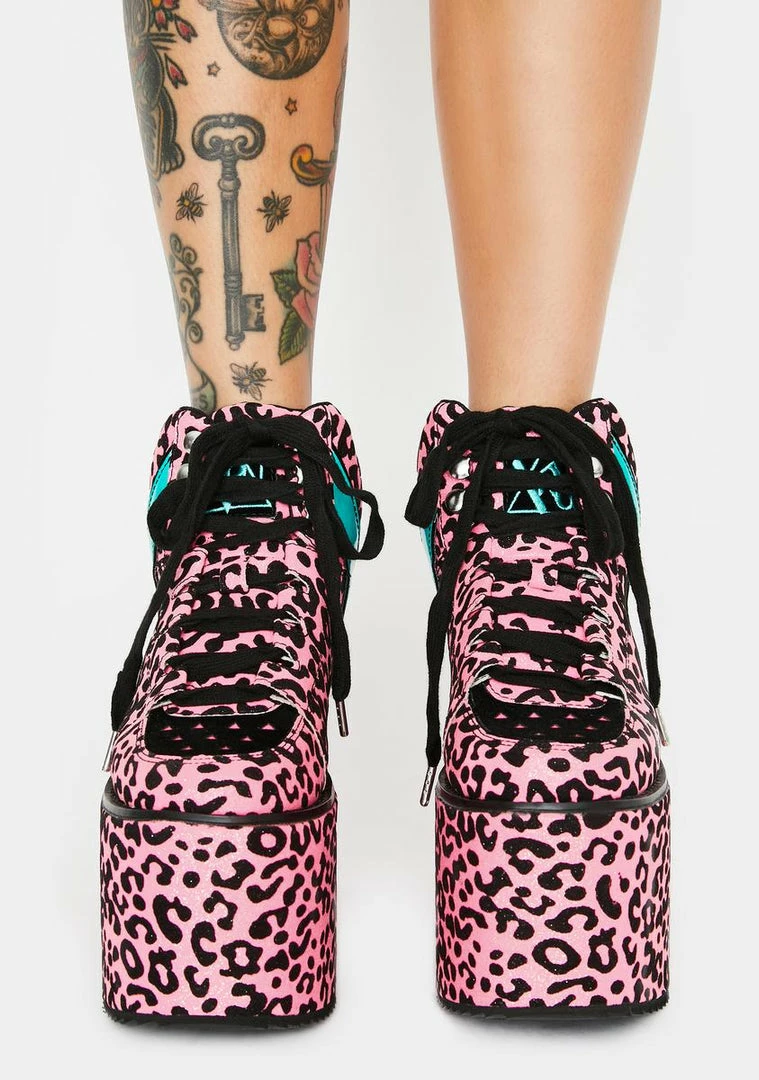 cuz youΓ’ΒΒre always on the prowl. Get high like catnip in these leopard platform sneakers that have adjustable lace-up closures, embroidered aliens on the back, and spike treaded soles.