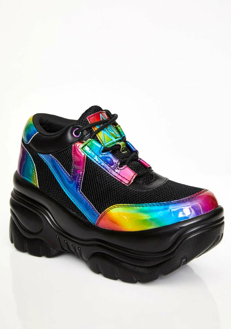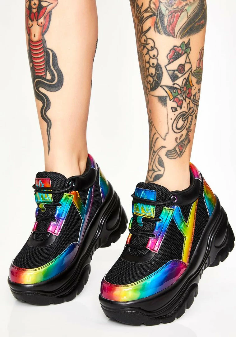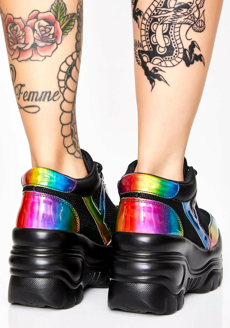 cuz nothing is what it seems. Take the red pill and drop into freaky fierceness with these thicc AF platforms that have patent rainbow realness, rounded toes, and lace-up closures.