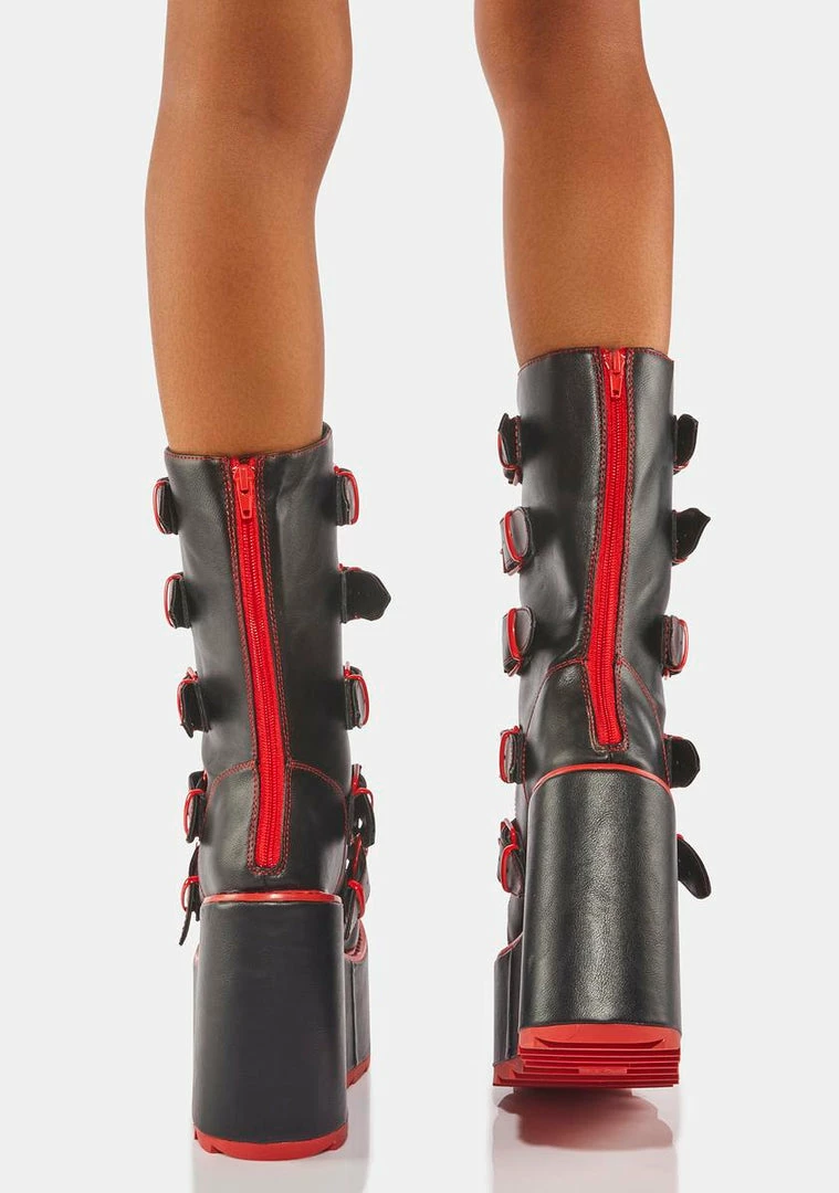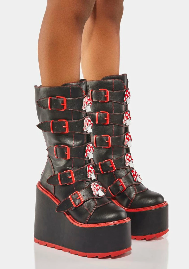 cuz you’re on a trip through wonderland, babe! These calf-high boots have a vegan leather construction with contrast red trim, wedge platform soles with rubber cleating, back zip closures, and adjustable buckle straps with mushroom enamel hardware.