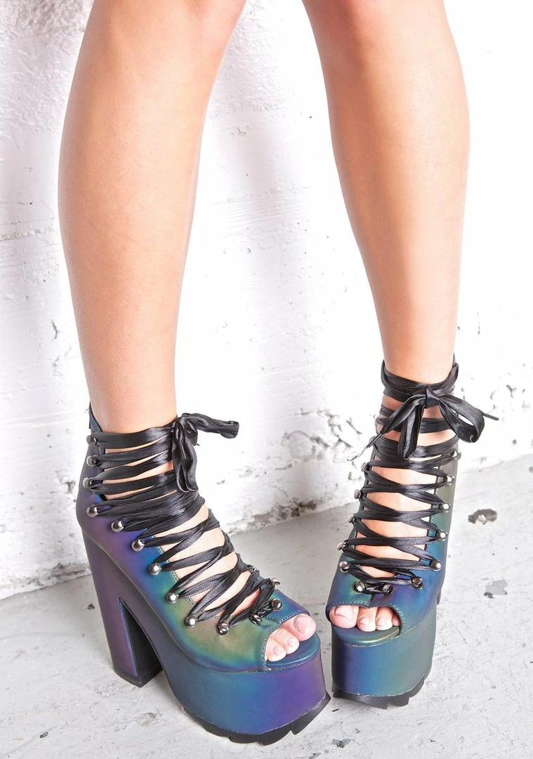 are gunna turn on tha f*xkinΓ’ΒΒ brights, bb~! These super eXXXclusive bbs are a collab with Y.R.U. and feature an trippy take on tha classikk ballet baes, featurinΓ’ΒΒ an insanely reflective oil slick construction that explodes with holographic shine when tha light hits just right, signature suuuper high heels Γ’ΒΒn platforms, full length black satin wrap style lace ups, and supa convenient zip back closure.