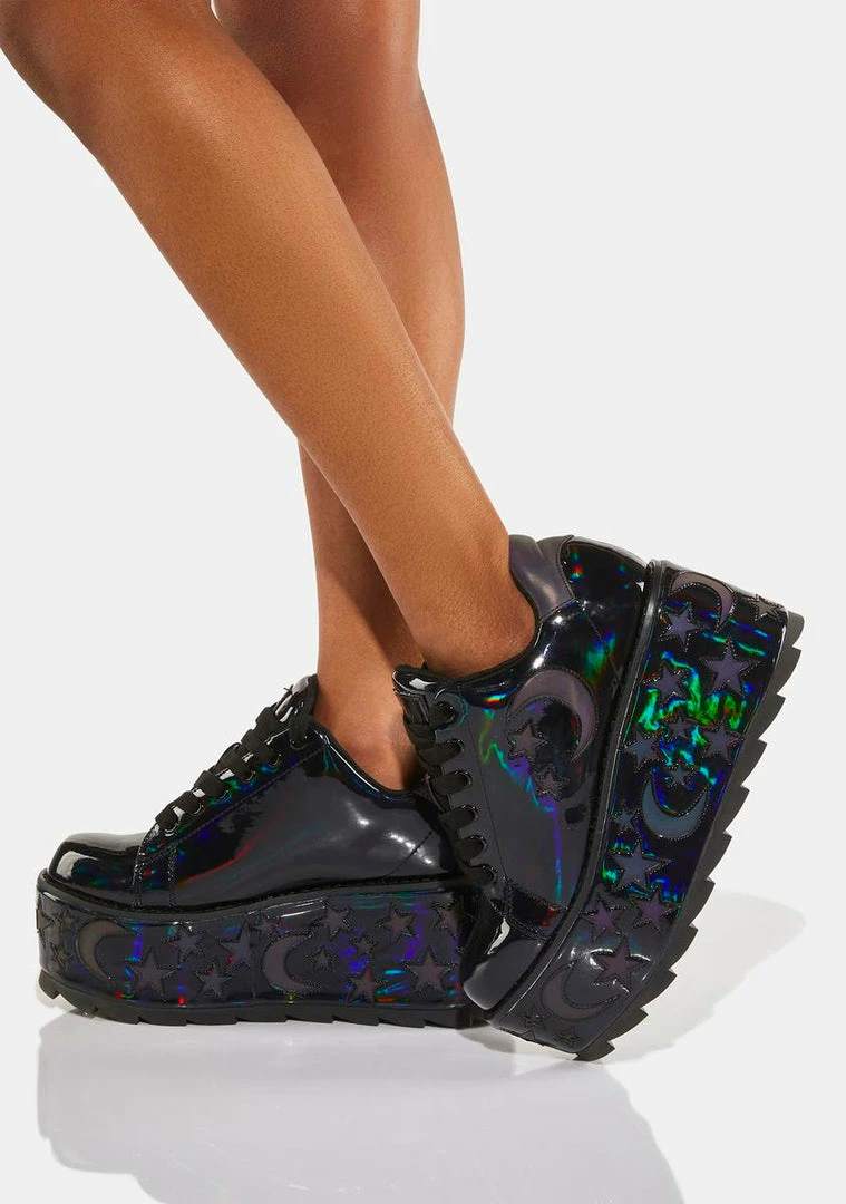 cuz youΓ’ΒΒre outta this world, bb! Rule the planets in these platform sneakers that have a holographic vegan leather construction, a reflective moon and stars print all over, adjustable lace-up closures, padded collars and tongues, and rubber cleated soles.