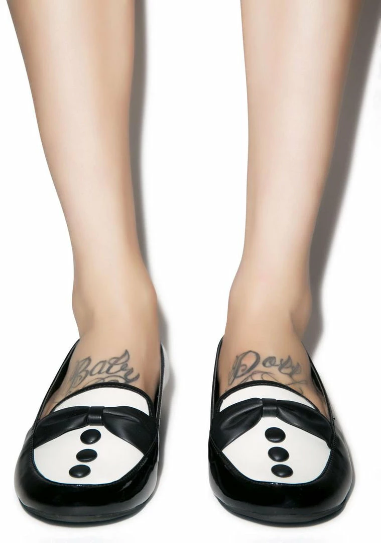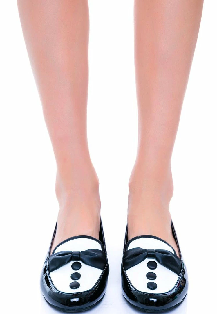 Y.R.U. Ritz Bow Tie Flat let’s meet you at the alter dollface. We’ll wear the white as long as you wear these really amazing shoes. These BBz are the bomb with their tuxedo detailinรย and slip-on fit. Featuring a shine around the body with a contrasting white front. These cuties are complete with button and bow details perfect for when yer about to say yer รยI Doรยs!รย