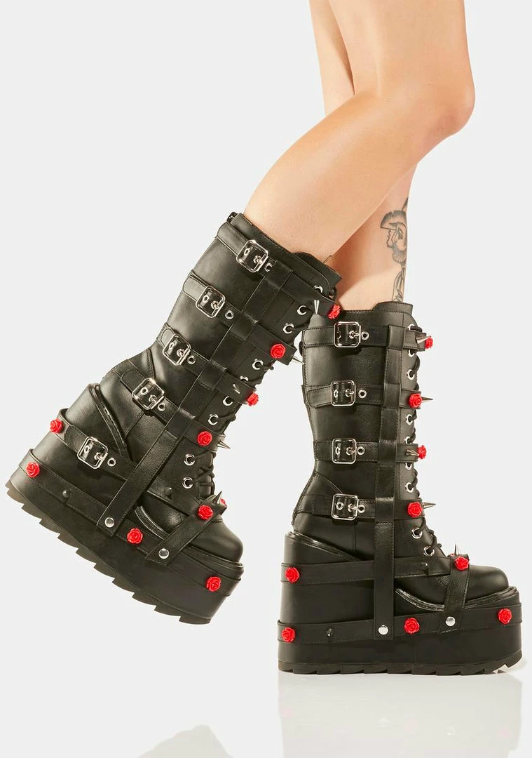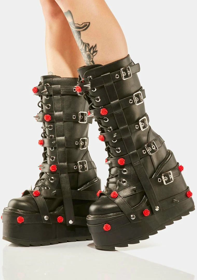 take a chance at rave romance! These wedge platform boots have a vegan leather construction, a calf-high fit, bondage buckle straps with rose details, adjustable laces, and back zip closures.