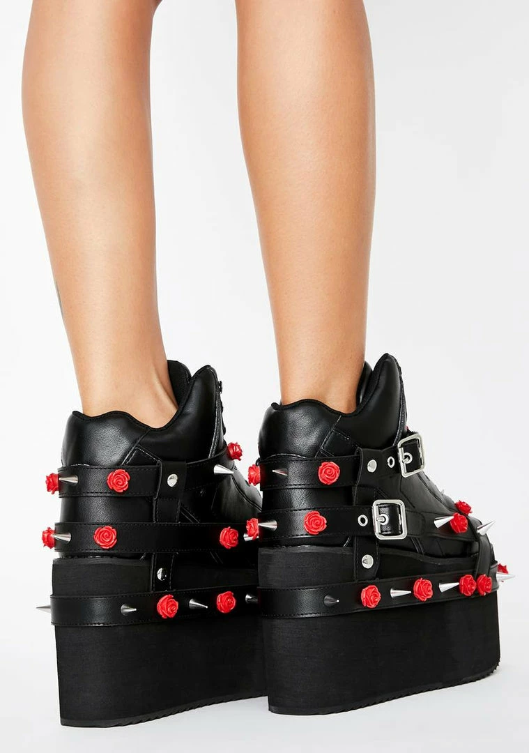 cuz every roze has itz thornz bb! Keep em in love with u while wearing these mega tall platform shoes with a lace up closure, cyberpunk straps, rose flowers and spikes all over.