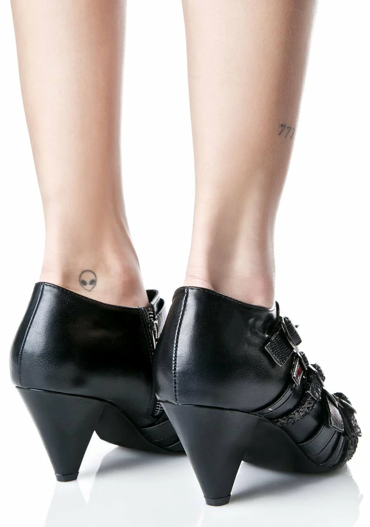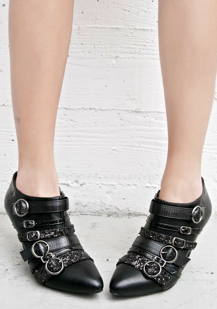 are gunna leave ya totally paralyzed, babe. These insane ankle booties feature a sleek black vegan leather construction, pointed toe, chunky 3รขยย tapered heel, tonz of buckled details strapped across the front in glitter, patent, รขยยN textured vegan leather in various sizes, and a side zip closure.