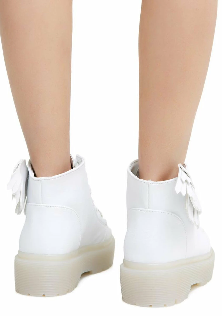 if you believe you can fly. These sikk white vegan leather boots have 3D wings on the sides, lace-up front, and cleated platforms soles that will have you feelinรขยย fly af.