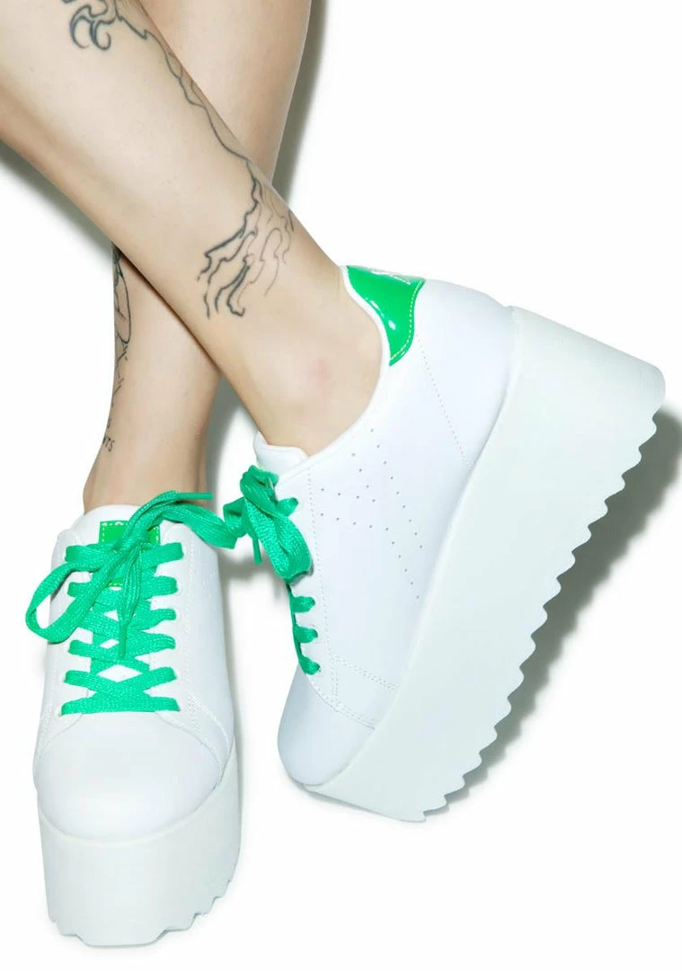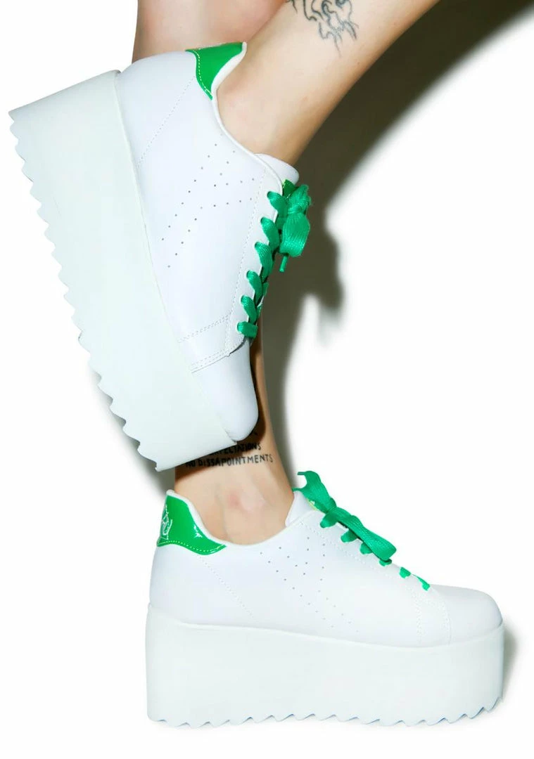 are gonna spice up yo lyfe. These athletic inspired white platform sneakers are constructed from extra soft vegan leather featuring a signature lightweight Eva platform, green laces and heel accent with embroidered logo and textured tread.