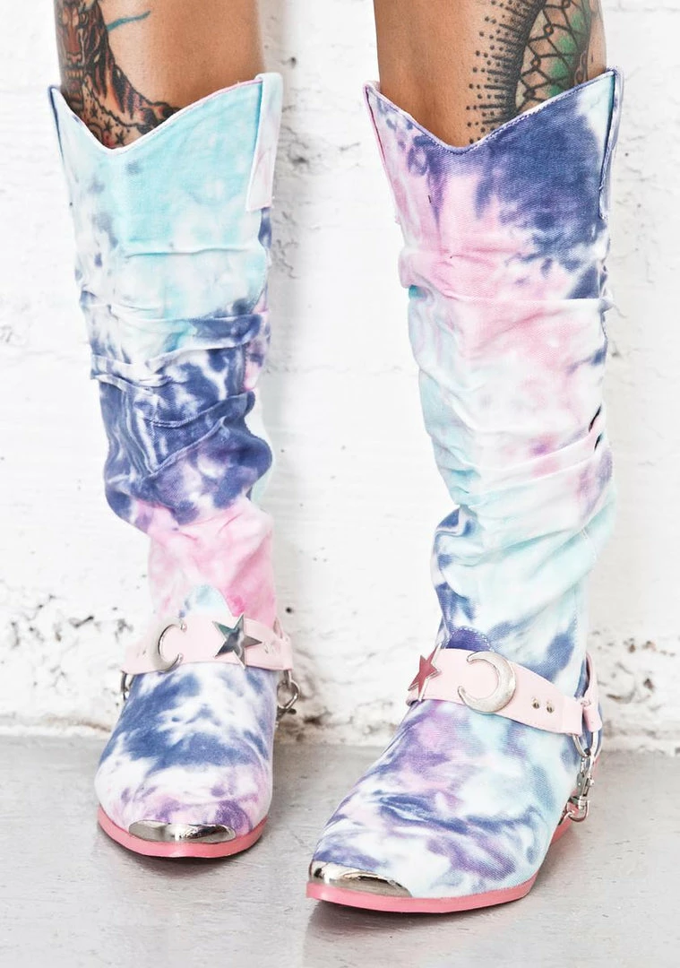 nothin’s gunna stop us now, bb! Show Γ’ΒΒem who the boss is around these parts in these amazing western boots, featurinΓ’ΒΒ a pretty pastel tie-dyed construction, slouchy fit, pointed toe with silver detailing, a pink sole Γ’ΒΒN wedge heel, and incredible baby pink wraparound belt straps with moon Γ’ΒΒN star charms across the front.