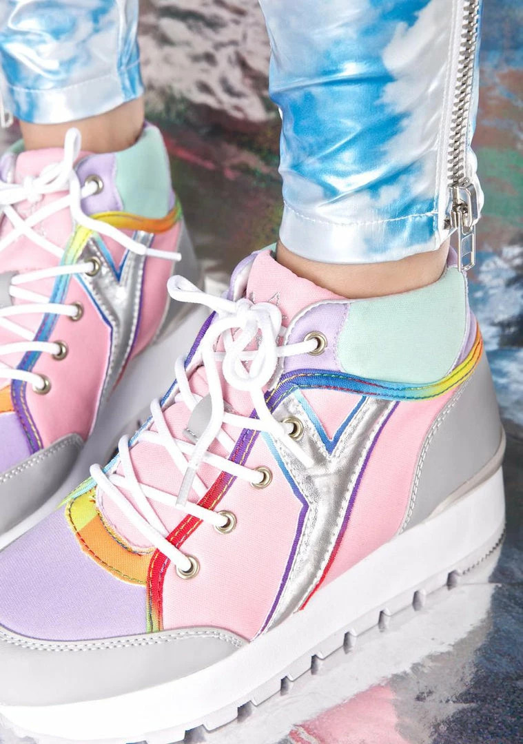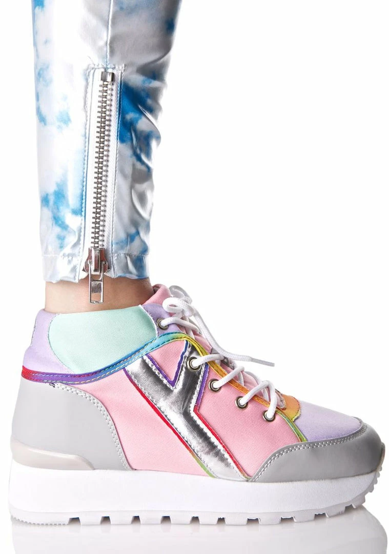 we luvv listeninΓ’ΒΒ to yer sweet songs, bb~ These dope hi-top sneakers feature a color blocked pastel vegan leather construction in pink, purple Γ’ΒΒN mint, rainbow gradient trim, thick white platform with contrasting treaded sole, shiny Γ’ΒΒYΓ’ΒΒ style side logo, embroidered alien on tha back of the heel, and full length lace-ups!