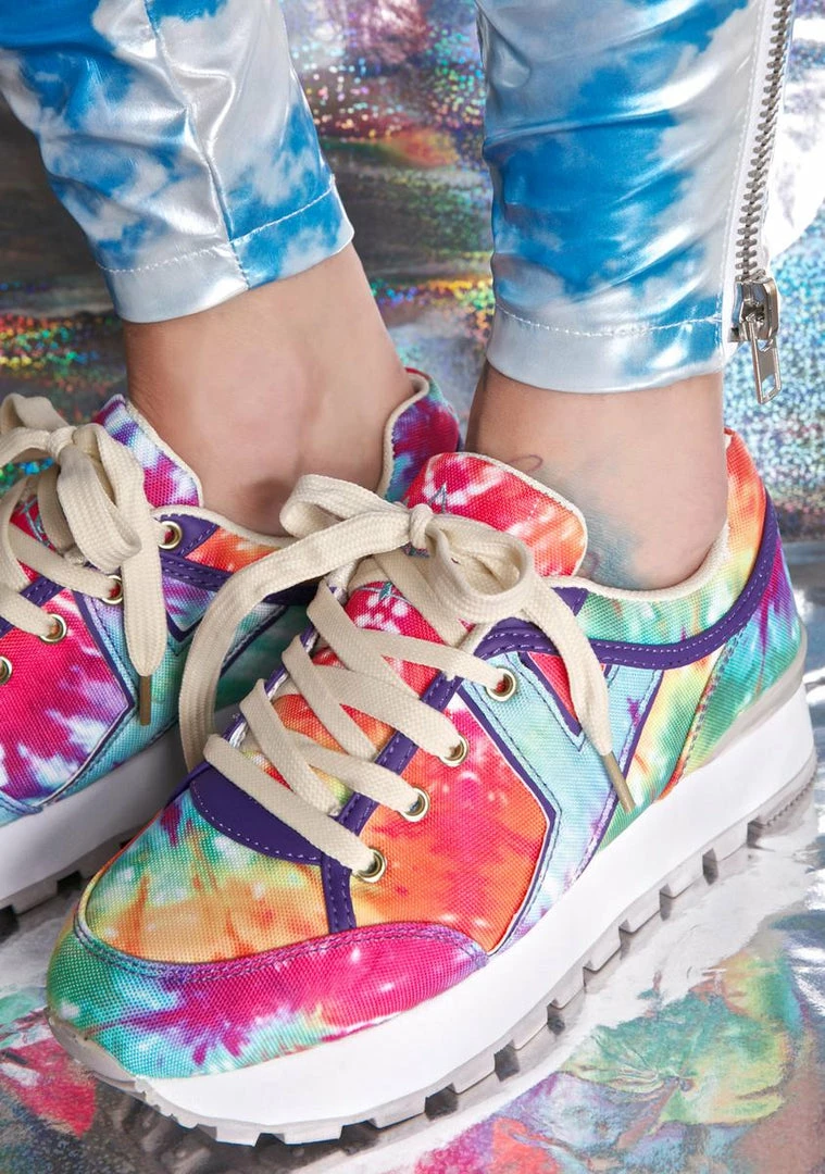 we luvv listeninΓ’ΒΒ to yer sweet songs, bb~ These dope sneakers feature a sleek fabric construction in a supa colorful rainbow tie-dyed print, purple vegan leather trim, thick white platform with contrasting treaded sole, Γ’ΒΒYΓ’ΒΒ style side logo, embroidered alien on tha back of the heel, and full length lace-ups!