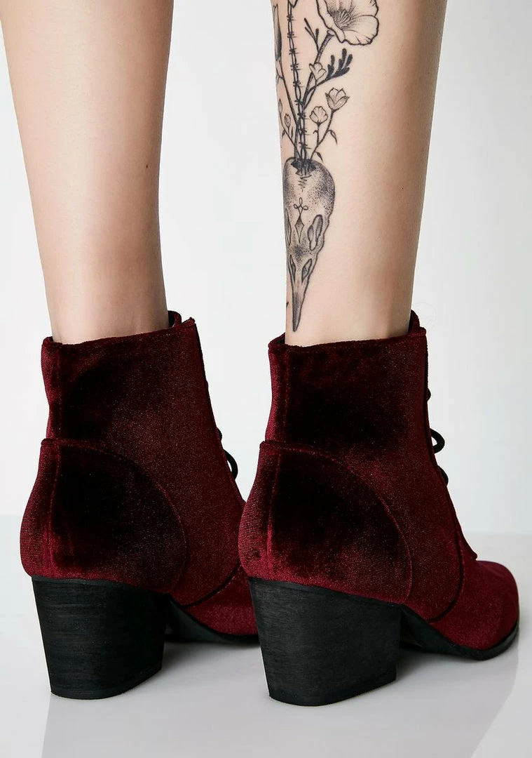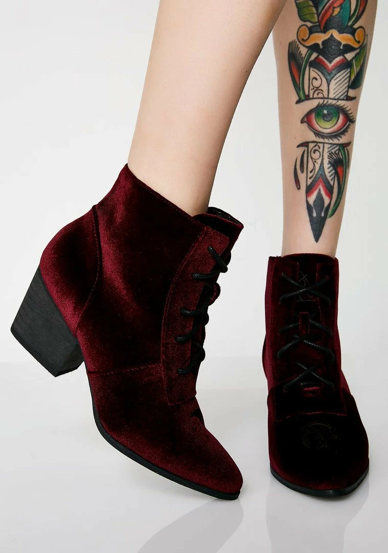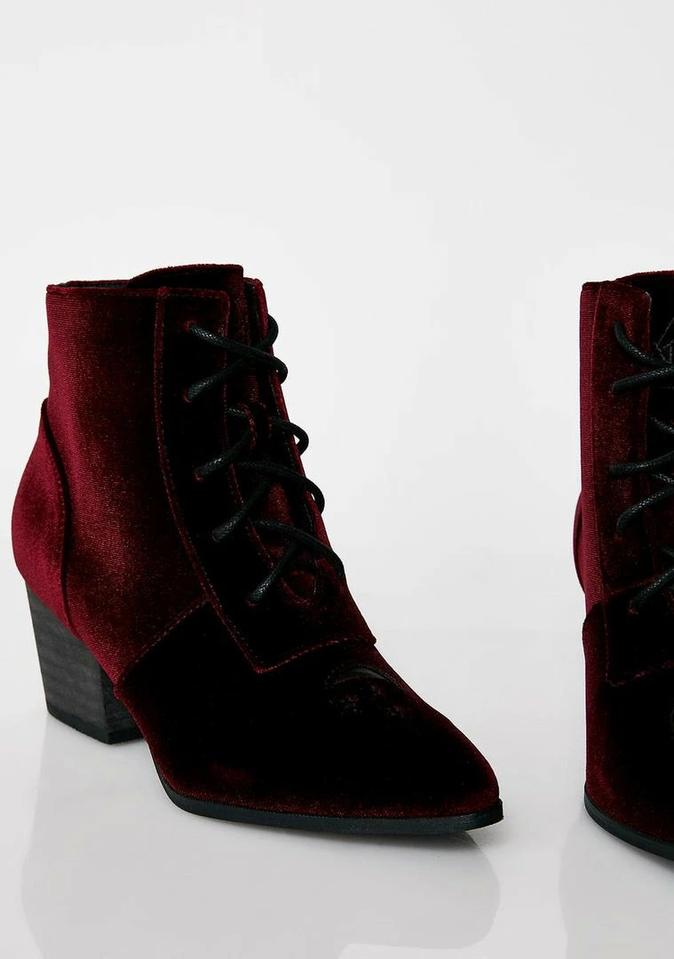 got Γ’ΒΒem feelinΓ’ΒΒ your vibez. These burgundy velvet boots have pointed toes, block heels, and lace-up front closures.