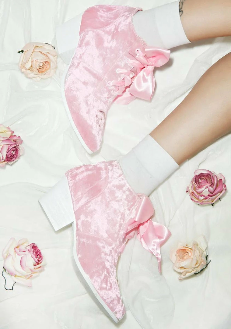yer aura radiates at a high frequency bb. These gorgeous ankle boots are covered in the cutest pink crushed velvet material with white contrasting 2 ΓΒΌΓ’ΒΒ inch stacked wooden heels. FeaturinΓ’ΒΒ a stunning star and moon cut-out at yer toes with clear vinyl overlay so we can see all the way through yer aura. With front satin lace closure these flattering velvet ankle boots will have ya feeling magical.