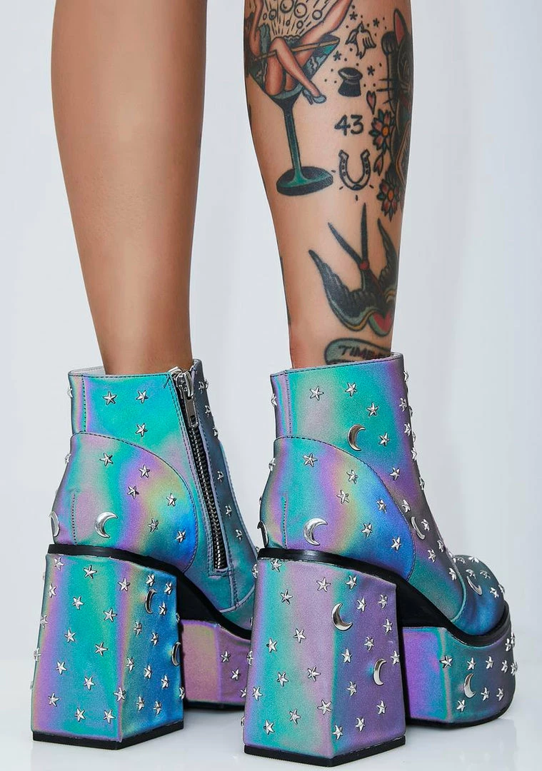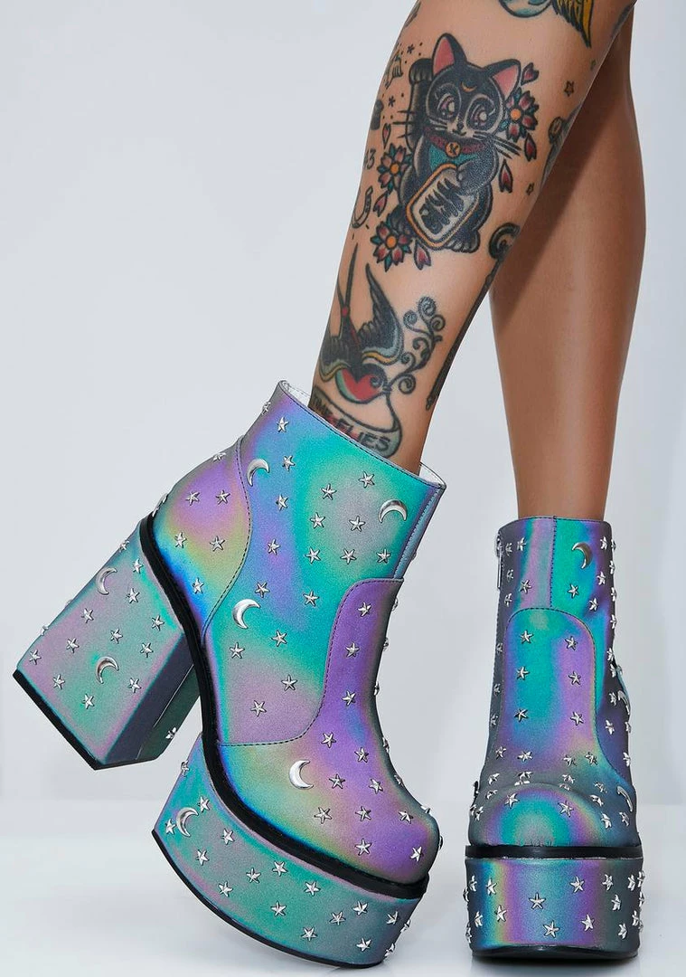 luv you to the moon Nรขยย back babe! These multi colored ankle booties have a sikk block heel Nรขยย comfy platforms with stars Nรขยย moons all ova and a side zipper closure.