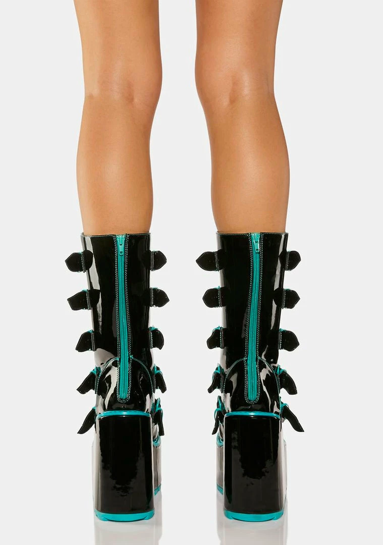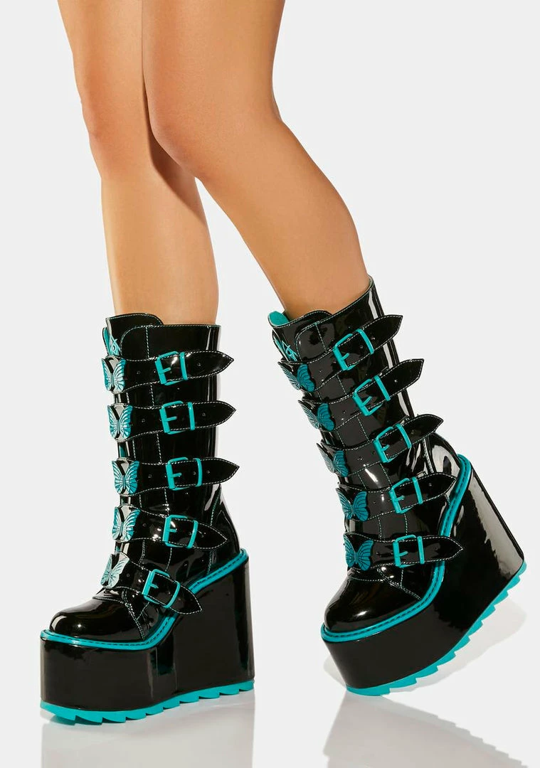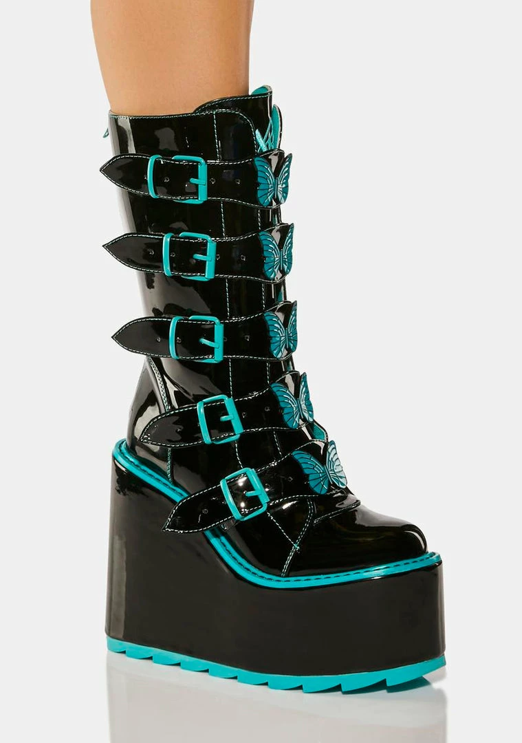 cuz you’re soaring into magical skies! These wedge platform boots have a patent vegan leather construction, contrast teal trim, adjustable buckle straps with butterfly enamel hardware, and back zip closures.