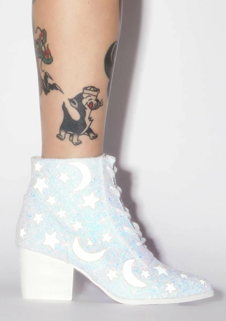 light up the sky, babe. Have âem wishinâ on a star in these dope AF ankle boots that have reflective moons Nâ stars, adjustable lace-up closures, and a supa glittery construction.