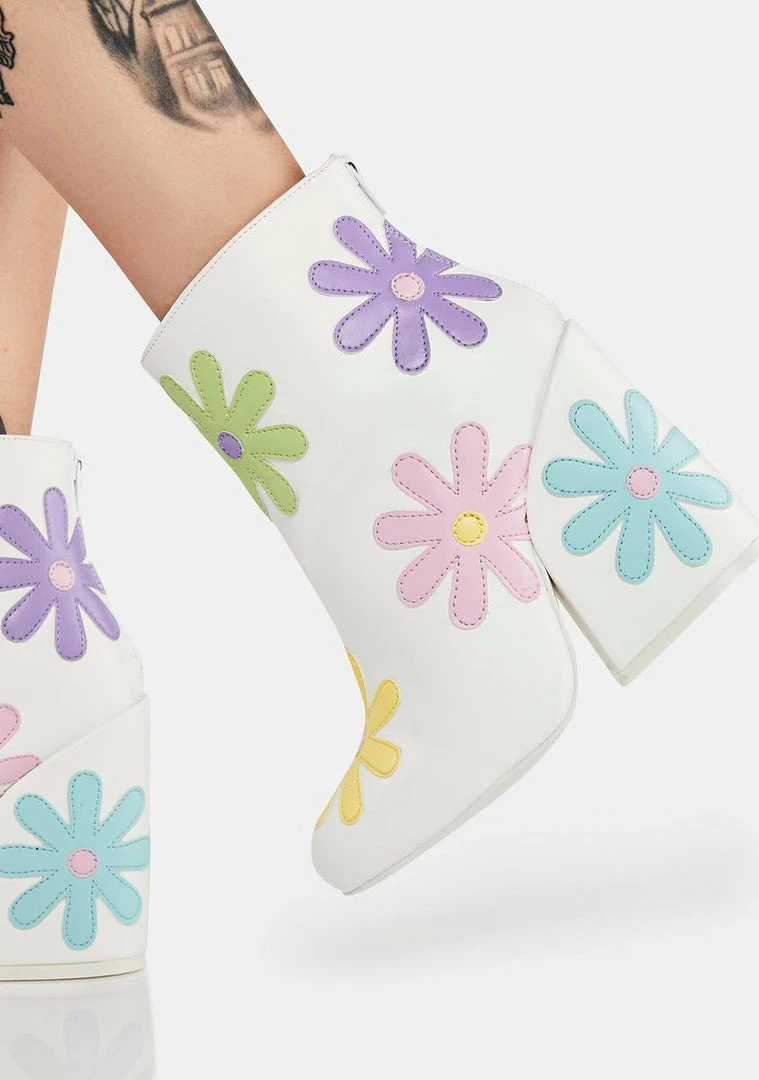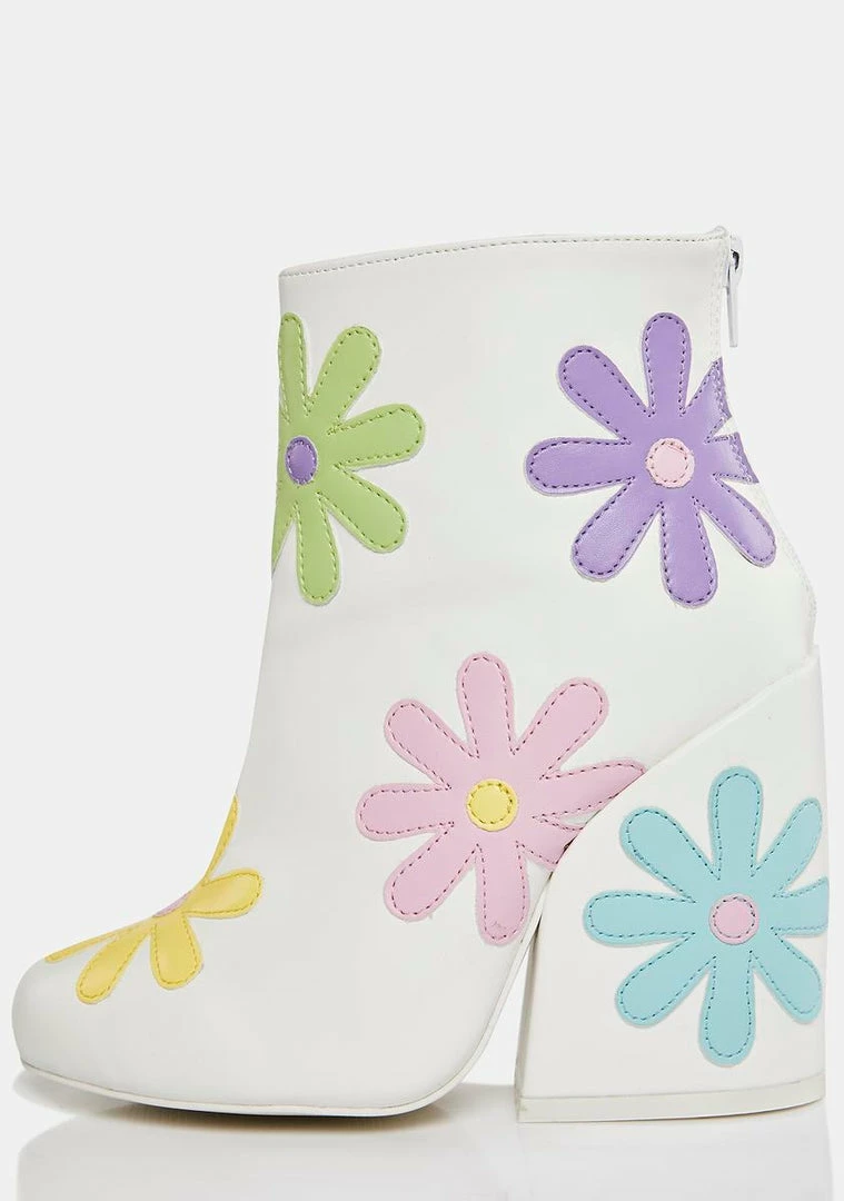 let’s go-go retro, babe! These chunky heeled ankle boots have a vegan leather construction, pastel flower details all over, and back zip closures.